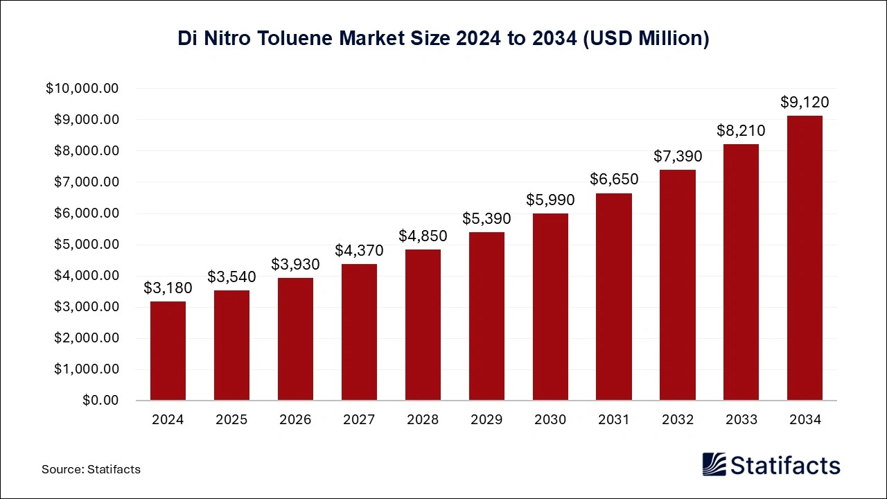 The global di nitro toluene market size is calculated at USD 3,180 million in 2024 and is predicted to reach around USD 9,120 million by 2034, expanding at a CAGR of 11.1% from 2024 to 2034.