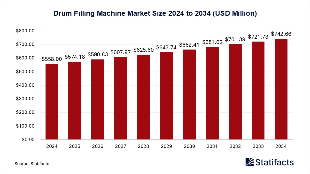 The global drum filling machine market size was estimated at USD 558 million in 2024 and is projected to be worth around USD 742.66 million by 2034, growing at a CAGR of 2.9% from 2024 to 2034.