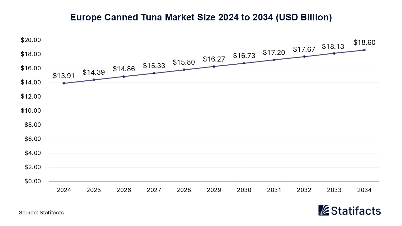 Privacy PolicyThe Europe canned tuna market size accounted for USD 13.91 Billion in 2024 and is predicted to touch around USD 18.6 Billion by 2034, growing at a CAGR of 2.94% from 2025 to 2034.