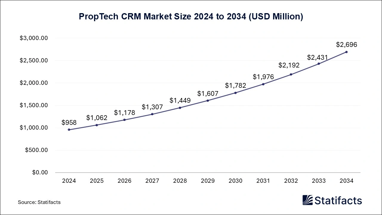 The global propTech CRM market size accounted for USD 958 million in 2024 and is expected to exceed around USD 2,696 million by 2034, growing at a CAGR of 10.9% from 2024 to 2034.